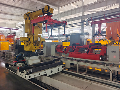 产品简介:叉车门架生产线集成了通过式抛丸、机加工、轴头自动拼点及焊接等工序,可将定尺的槽钢原材料制造成应用于叉车内、中、外门架的槽